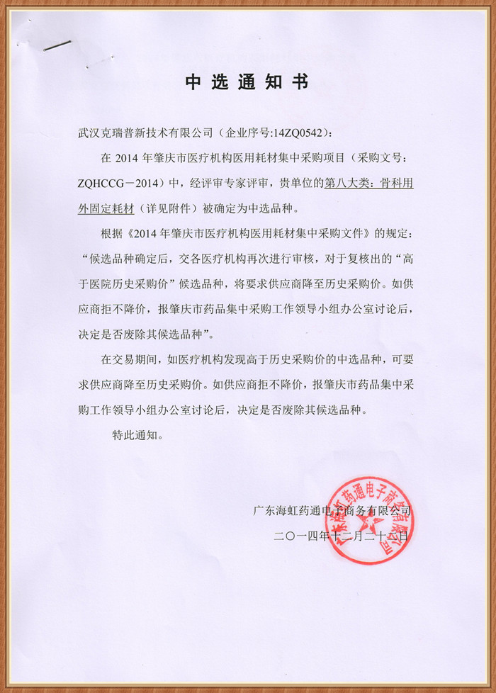 【廣東省2014年肇慶市醫(yī)療機(jī)構(gòu)醫(yī)用耗材集中采購(gòu)項(xiàng)目中標(biāo)通知書】武漢克瑞普新技術(shù)有限公司(采購(gòu)文號(hào):ZQHCCG-2014)中我們公司生產(chǎn)的骨科用外固定耗材產(chǎn)品已成功中標(biāo),我們的骨科耗材產(chǎn)品種類較多,全部為一類的骨科耗材產(chǎn)品歡迎各大經(jīng)銷商與我們?nèi)〉寐?lián)系。