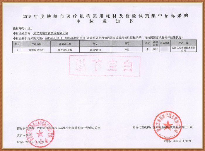 【遼寧省2015年度鐵嶺市醫(yī)療機構(gòu)醫(yī)用耗材及檢驗試劑集中招標(biāo)采購中標(biāo)通知書】我們東科圣康品牌的胸腔固定夾板術(shù)前術(shù)后外固定耗材在2015年度鐵嶺市醫(yī)療機構(gòu)集中采購中已成功中標(biāo),中標(biāo)價格較為優(yōu)惠產(chǎn)品醫(yī)生操作起來比較簡單,而且可以提升接診率,產(chǎn)品輕便舒適等特點。