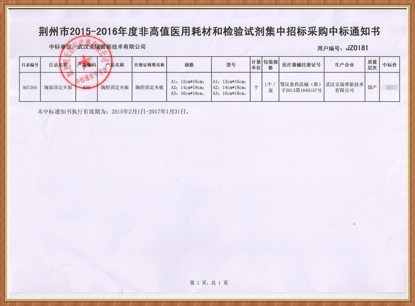 【湖北省荊州市2015-2016年度非高值醫(yī)用耗材和檢驗(yàn)試劑集中招標(biāo)采購(gòu)中標(biāo)通知書(shū)】武漢克瑞普新技術(shù)有限公司在荊州市醫(yī)療機(jī)構(gòu)非高值醫(yī)用耗材和檢驗(yàn)試劑集中招標(biāo)采購(gòu)項(xiàng)目中我司經(jīng)評(píng)標(biāo)委員會(huì)的評(píng)審決定成功獲得了中標(biāo)的資格,我們本次中標(biāo)的產(chǎn)品是我廠家較為關(guān)注的一款產(chǎn)品那就是我們的東科圣康品牌的胸腔固定夾板產(chǎn)品,這款產(chǎn)品在醫(yī)院以臨床使用中較為良好,我們歡迎各大經(jīng)銷(xiāo)商與我們?nèi)〉煤献鳌?/span>