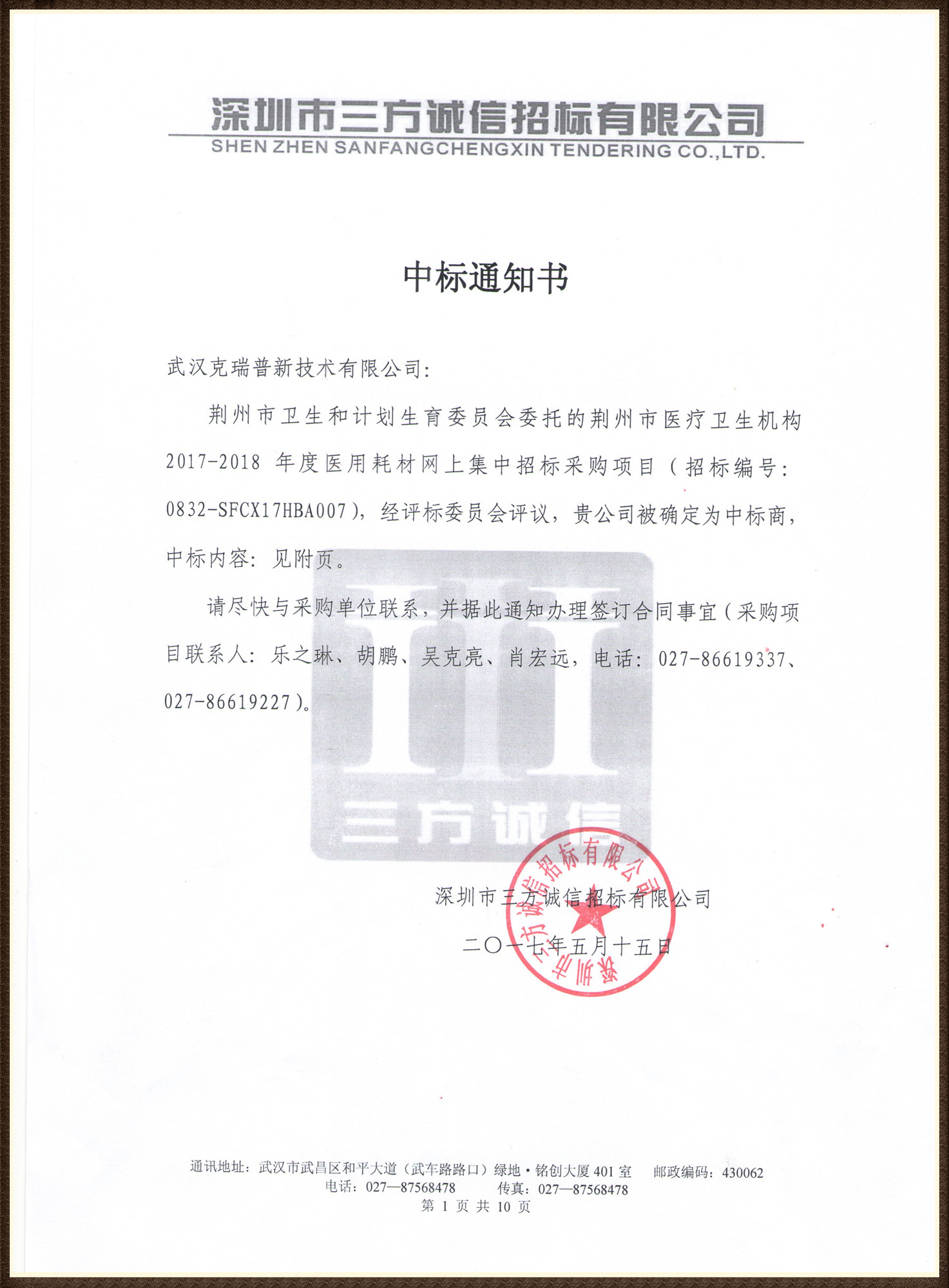 【湖北省荊州市衛(wèi)生機(jī)構(gòu)2017-2018年度醫(yī)用耗材網(wǎng)上集中招標(biāo)采購(gòu)項(xiàng)目中標(biāo)通知書(shū)】武漢克瑞普在2017-2018年度荊州市醫(yī)用耗材集中招標(biāo)采購(gòu)項(xiàng)目中成功中標(biāo)了以下骨科耗材產(chǎn)品具體有:胸腔固定夾板、高分子固定繃帶、高分子固定夾板、醫(yī)用固定帶(種類包含多樣)、醫(yī)用外固定支具等骨科耗材在評(píng)標(biāo)委員會(huì)的評(píng)判下我司被確定為中標(biāo)商。