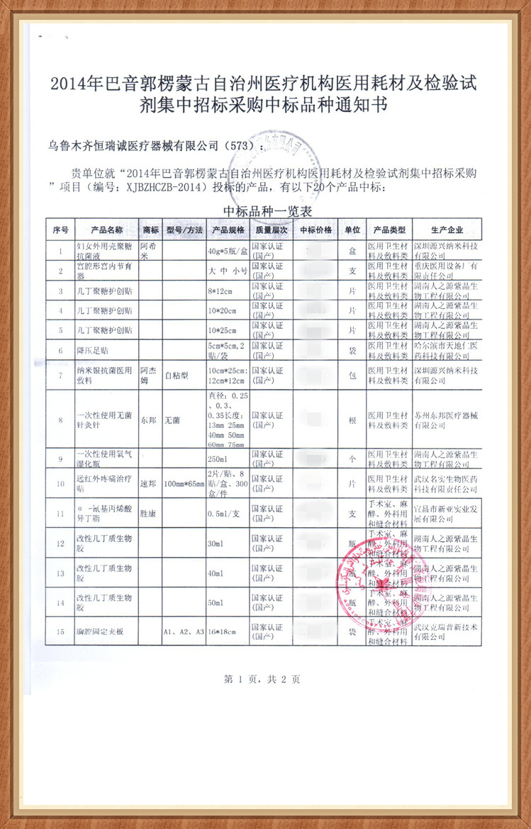 【2014年巴音郭楞蒙古自治州醫(yī)療機(jī)構(gòu)醫(yī)用耗材及檢驗(yàn)試劑集中招標(biāo)采購(gòu)中標(biāo)品種通知書】我們武漢克瑞普公司在2014年蒙古自治州醫(yī)用耗材招標(biāo)采購(gòu)項(xiàng)目中我們的胸腔固定夾板(A1、A2、A3)型脫穎而出成功成為了中標(biāo)產(chǎn)品。
