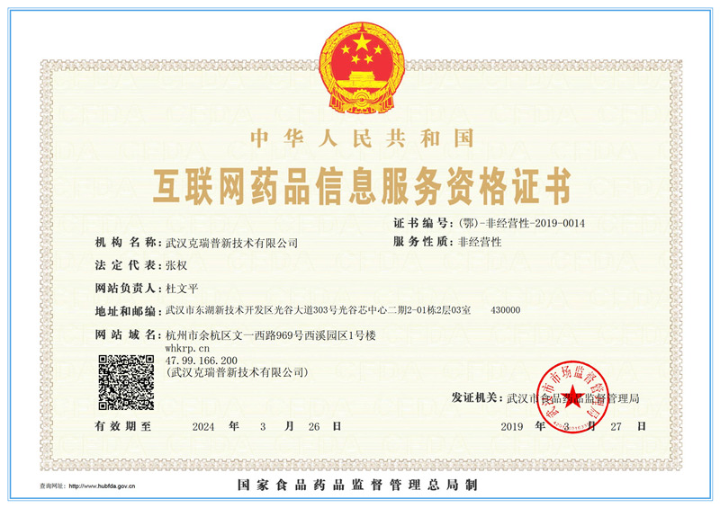 武漢克瑞普新技術(shù)有限公司于2019年3月27日取得了湖北省武漢市食品藥品監(jiān)督管理局(武漢市市場(chǎng)監(jiān)督管理局)頒發(fā)的《互聯(lián)網(wǎng)藥品信息服務(wù)資格證書》,公司網(wǎng)站 whkrp.cn,該證書編號(hào):(鄂)-非經(jīng)營性-2019-0014,互聯(lián)網(wǎng)藥品信息服務(wù)資格證書***期為2019年3月27日至2024年3月26日止。