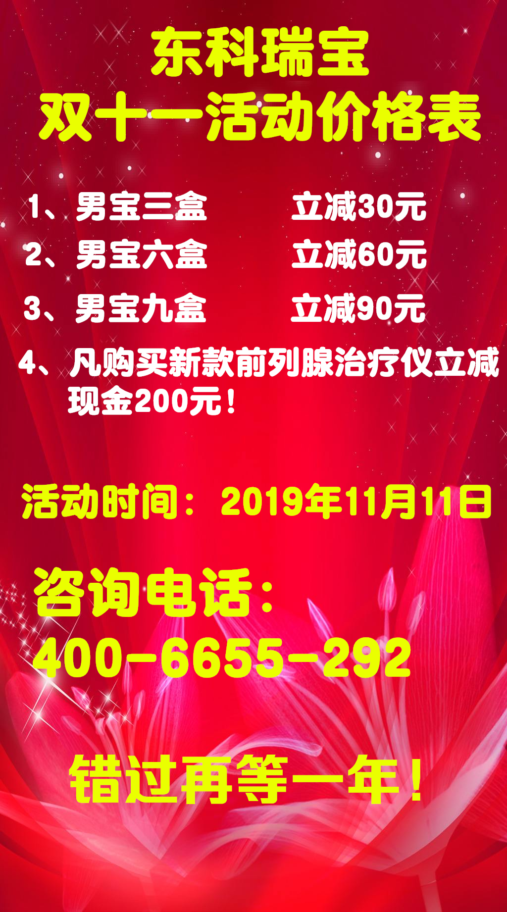 東科瑞寶前列腺治療儀雙十一大促 錯過再等一年! 東科瑞寶前列腺治療儀廠家雙十一大促,購買男寶抗菌凝膠3盒立減30,6盒立減60,9盒立減90!購買新款儀器,立減現(xiàn)金200元!活動僅限2019年11月11日當(dāng)天!錯過再等一年!
