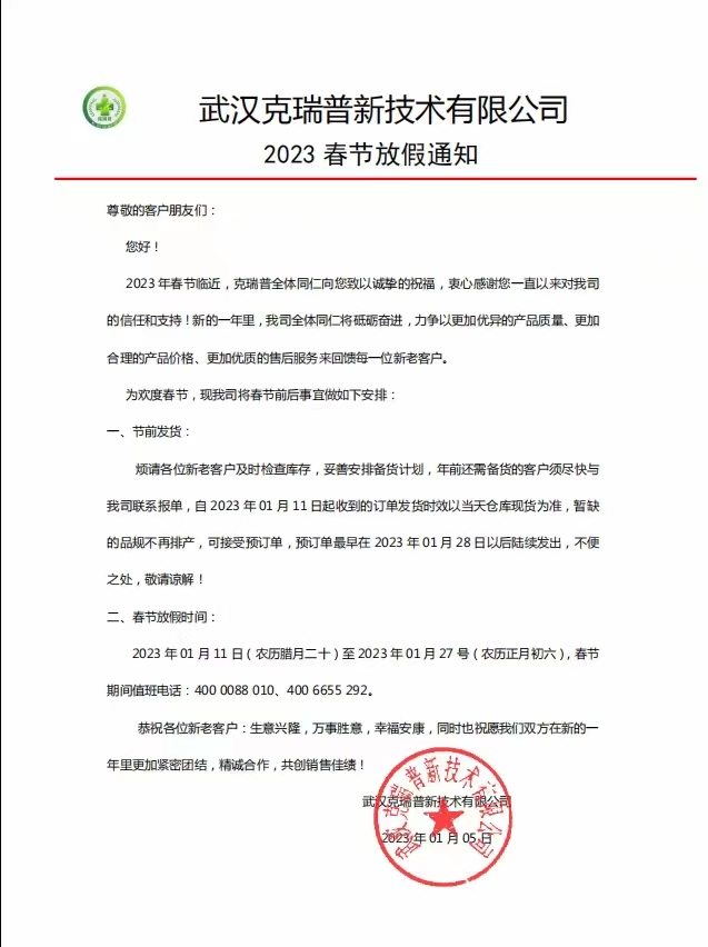 武漢克瑞普新技術(shù)有限公司2023年春節(jié)放假通知