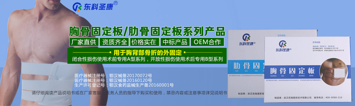 企業(yè)產(chǎn)品中,東科圣康品牌旗下的胸肋骨固定板系列、醫(yī)用高分子夾板繃帶系列、醫(yī)用固定帶系列、醫(yī)用外固定支具系列、醫(yī)用外固定夾板系列等產(chǎn)品,是國(guó)內(nèi)外各大醫(yī)療機(jī)構(gòu)廣泛使用的醫(yī)用產(chǎn)品,該品牌系列產(chǎn)品經(jīng)國(guó)家食品藥品監(jiān)督管理局審核批準(zhǔn),產(chǎn)品已達(dá)到國(guó)家標(biāo)準(zhǔn),可進(jìn)入各類醫(yī)療機(jī)構(gòu)的骨傷科、胸外科、康復(fù)科、急診科、120急救等部門臨床使用.......