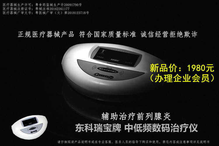 前列腺治療儀哪款好?專業(yè)人士提醒購買理療康復(fù)產(chǎn)品,還是請選擇正規(guī)器械生產(chǎn)廠家、資質(zhì)齊全的產(chǎn)品為妥。(2019新款上市)東科瑞寶牌前列腺儀器產(chǎn)品(輔助治療前列腺炎專用中低頻數(shù)碼治療儀)新品上市,銷售價:1980元/套(辦理企業(yè)會員,享受會員服務(wù)與權(quán)益),該家用型治療儀器為二類準(zhǔn)字醫(yī)療器械產(chǎn)品,采用多級性中低頻復(fù)合脈沖,符合國家YY0505標(biāo)準(zhǔn)電磁兼容有關(guān)要求,該治療儀器使用220v交流電源,具有耐壓4000伏和上電無輸出自鎖的安防功能, 廠家一年三包質(zhì)保售后,可適用于家庭、中小醫(yī)療機構(gòu)、鄉(xiāng)鎮(zhèn)醫(yī)院、社區(qū)診所理療科室等。