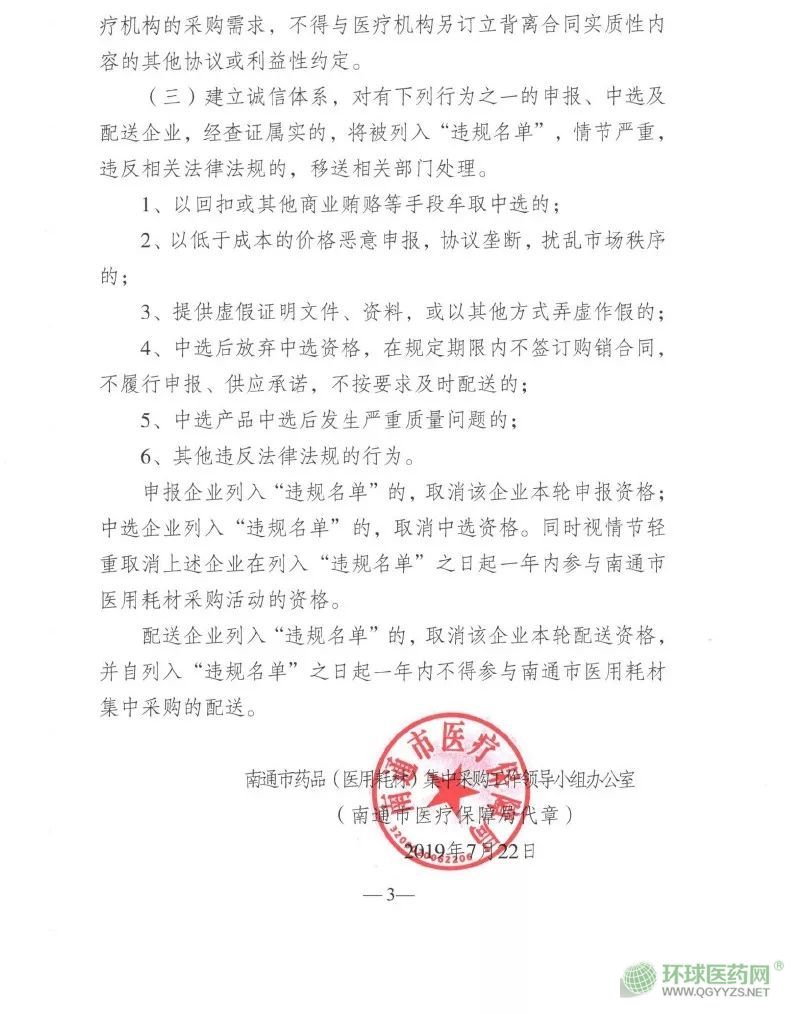此外,南通市建立違規(guī)名單以及加強誠信體系,涉賄、惡意競爭、中選后出現(xiàn)嚴重質量情況等將被列入違規(guī)名單,生產經營企業(yè)一年內不得參與南通市的耗材招標采購活動。