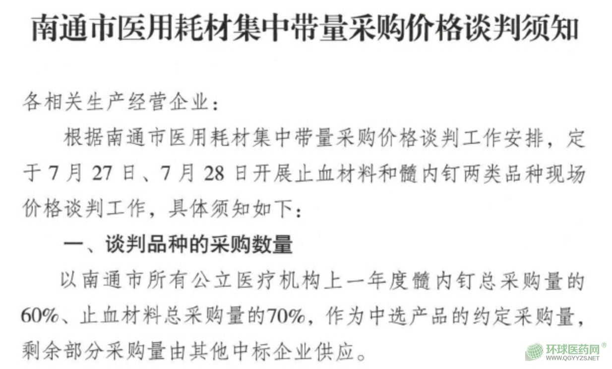 根據(jù)南通市的“價格談判須知”,約定髓內釘?shù)牟少徚繛?018年度全市醫(yī)院總采購量的60%,止血材料的采購量為2018年度總采購量的70%,剩余部分采購量由其他中標企業(yè)供應。