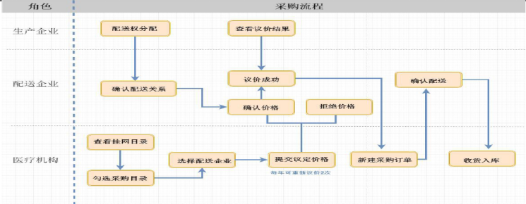企業(yè)通過平臺(tái)“公示欄”查看公示掛網(wǎng)產(chǎn)品信息。掛網(wǎng)成功的產(chǎn)品,企業(yè)使用CA或賬號(hào)登錄進(jìn)入交易系統(tǒng),確定配送關(guān)系,開展醫(yī)療機(jī)構(gòu)網(wǎng)上議價(jià)采購(gòu)。