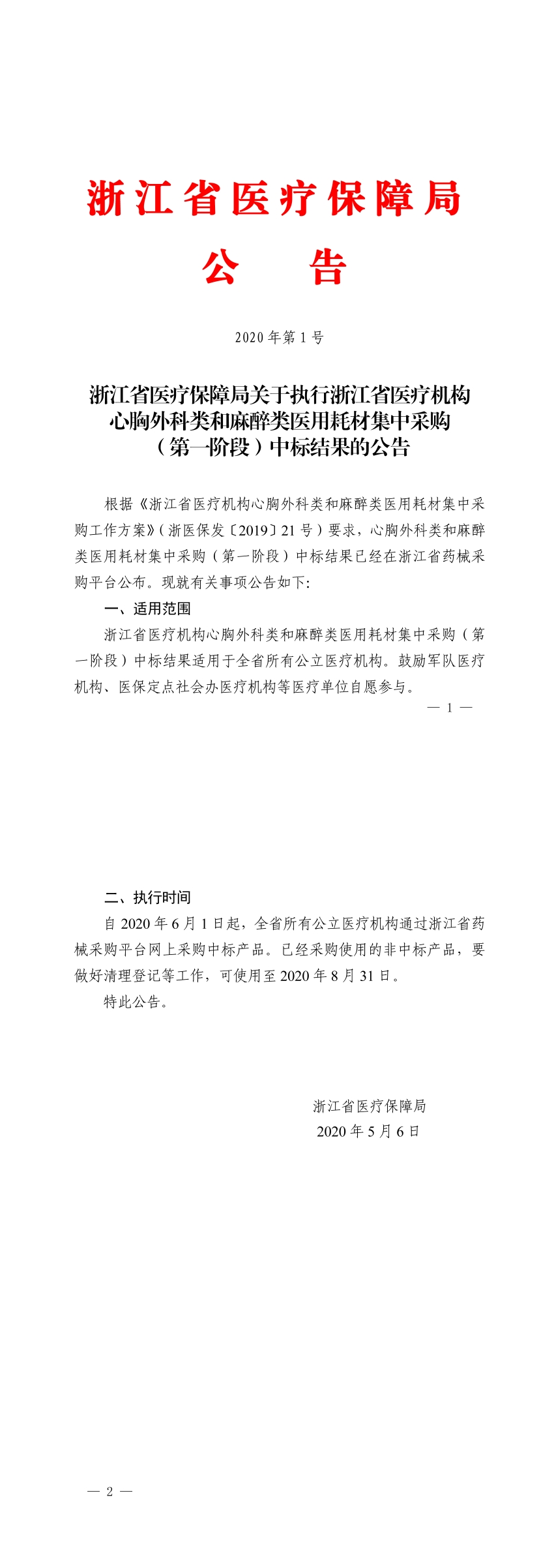 《關(guān)于執(zhí)行浙江省醫(yī)療機(jī)構(gòu)心胸外科類(lèi)和麻醉類(lèi)醫(yī)用耗材集中采購(gòu)(第 一階段)中標(biāo)結(jié)果的公告》